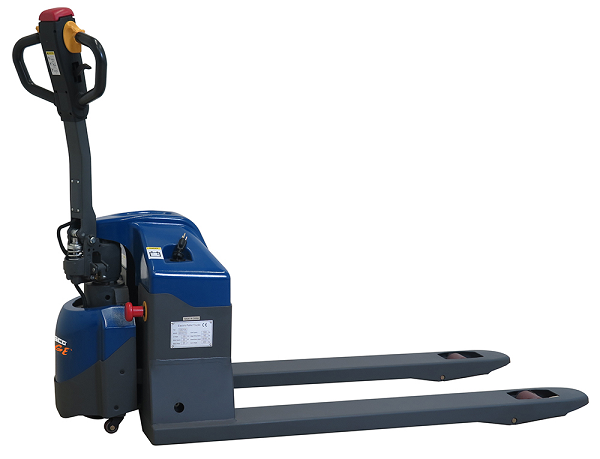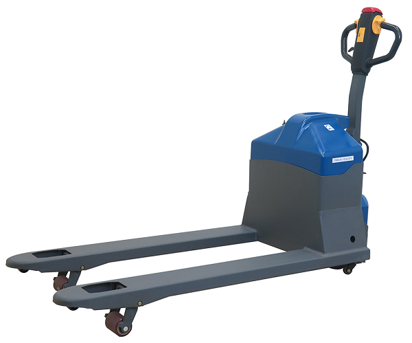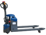 This semi-electric pallet jack is used to lift and move palletized loads with less physical effort. Operators slide the forks under the pallet, raise the load using the electric lift system, and manually guide the pallet to the desired location. The controlled lowering function ensures safe and precise placement.